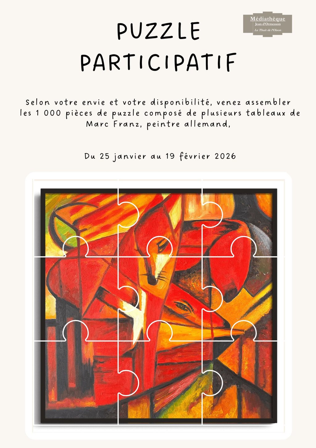 Selon votre envie et votre disponibilité, venez assembler les 1 000 pièces de puzzle composé de plusieurs tableaux de Marc Franz, Peintre Allemand, à la Médiathèque Jean d'Ormesson.